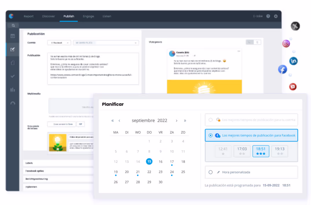 Máximo alcance garantizado: elige siempre el momento óptimo para tus publicaciones en redes sociales. El Post Optimiser ofrece automáticamente las mejores opciones para tu cuenta, plataforma o sector.